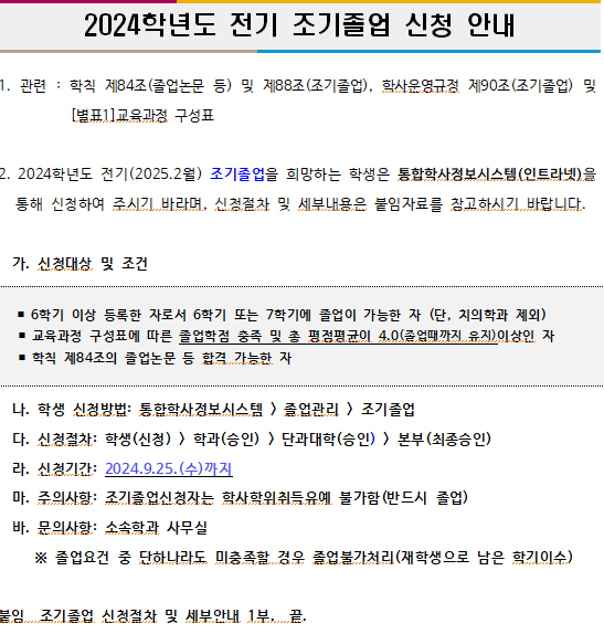 2024학년도 전기(25년 2월) 조기졸업 신청 안내