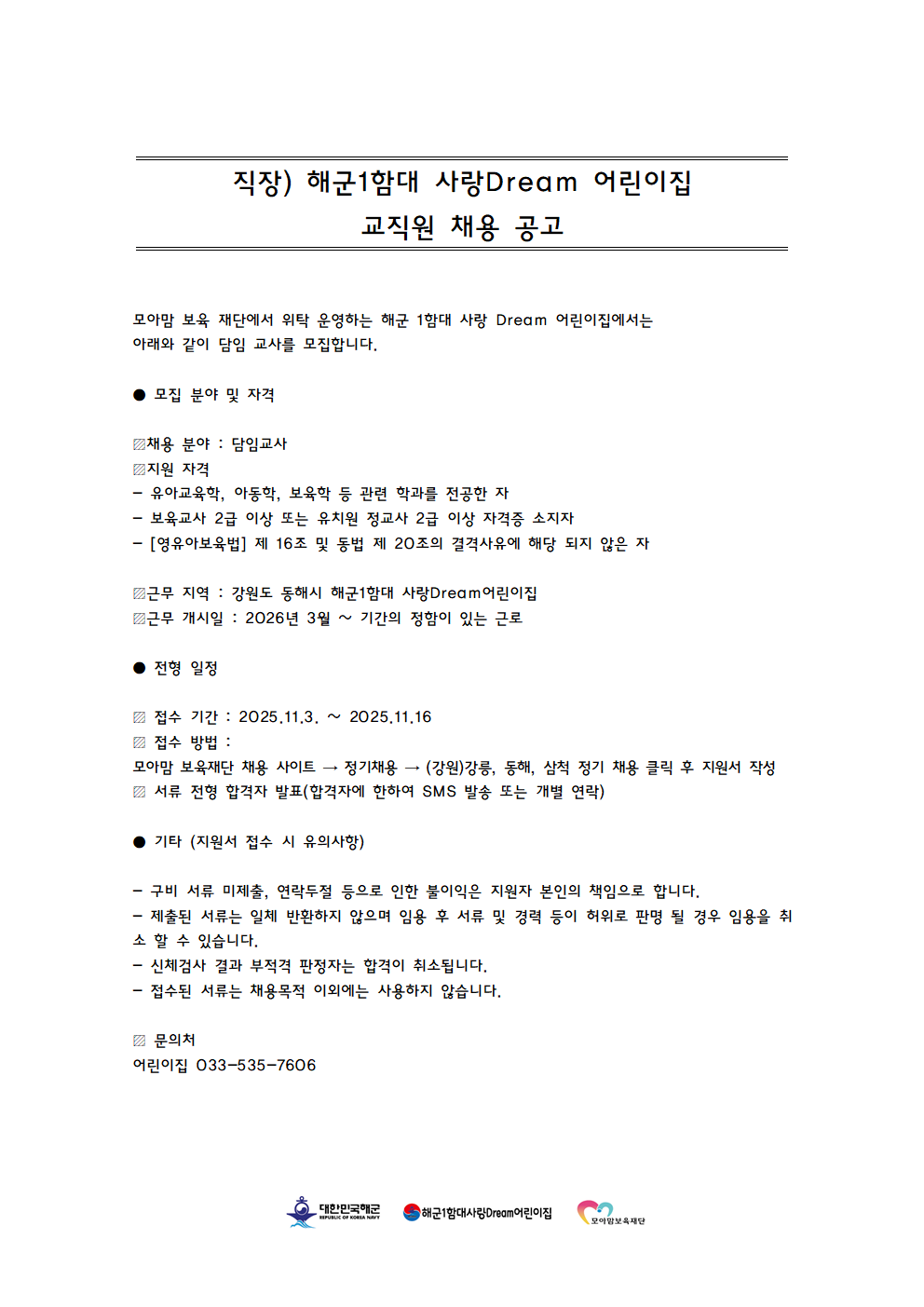 fnctId=bbs,fnctNo=208 해군1함대 사랑Dream 어린이집 교직원 채용 작성일 2025.11.10 작성자 신시원 조회수 514 첨부파일 첨부파일이(가) 없습니다. 다음글 강릉원주대학교 해람어린이집 보육교직원 모집 공고 신시원 2025-11-17 14:27:43.0 이전글 2025학년도 봉대초등학교병설유치원 하계 방학 중 방과후과정 인력 채용 공고 신시원 2025-06-20 09:24:39.0 총 16 개의 게시물이 있습니다. 게시물 검색 제목 작성자 게시글 리스트 취업정보 번호 제목 작성자 작성일 댓글 조회수 첨부파일 16 강원특별자치도자연학습원 직원 공개 채용 신시원 2026.01.12 0 291 1 15 강릉원주대학교 해람어린이집 보육교직원 모집 공고 신시원 2025.11.17 0 726 1 14 해군1함대 사랑Dream 어린이집 교직원 채용 신시원 2025.11.10 0 514 0 13 2025학년도 봉대초등학교병설유치원 하계 방학 중 방과후과정 인력 채용 공고 신시원 2025.06.20 0 2062 0 12 하이원 정선 어린이집(강원랜드 직장어린이집(한솔보육재단)) 보육교사 채용 공고 신시원 2024.07.17 0 5849 0 11 <원주소방서어린이집 담임교사 구인> 신시원 2024.03.11 0 5810 0 10 근로복지공단 동해어린이집 보육교직원 채용 공고 신시원 2023.11.24 0 4038 0 9 푸른자연 유치원 교사 구인 안내 신시원 2023.08.14 0 1727 0 8 2023년 강릉원주대학교 해람어린이집 교사 채용공고 신시원 2022.12.14 0 2197 2 7 근로복지공단 동해어린이집 보육교사 채용 공고 신시원 2022.11.23 0 2231 0 처음 12 1 2 다음 페이지 끝