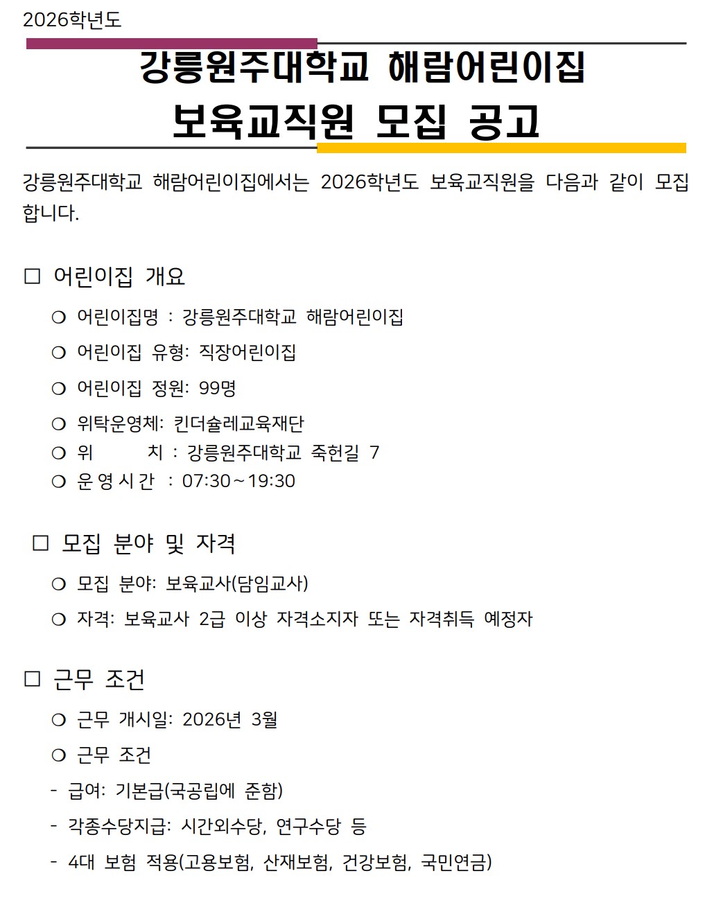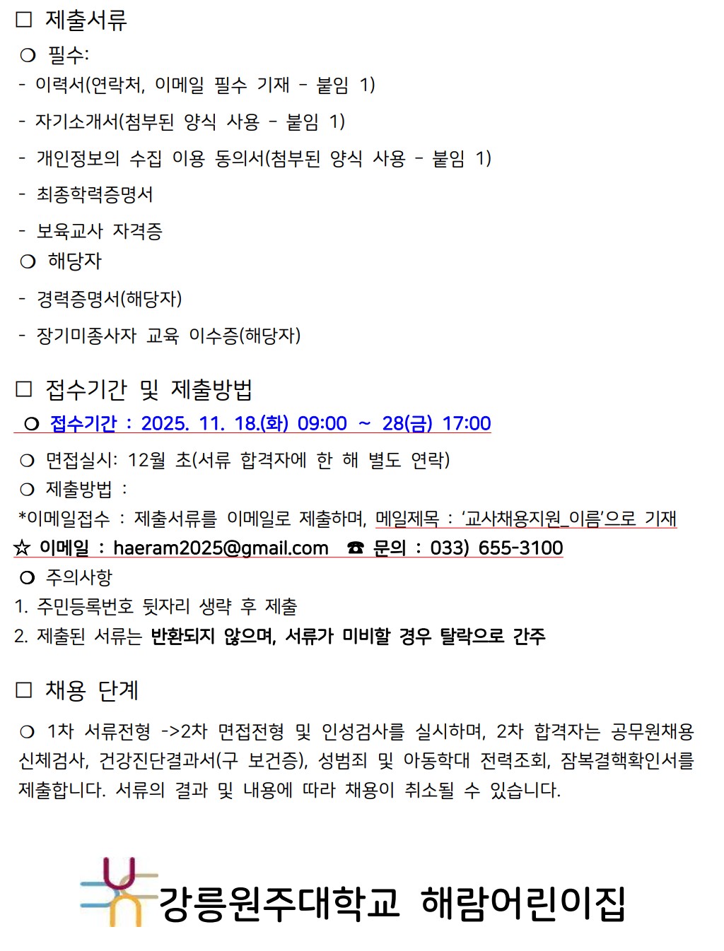 fnctId=bbs,fnctNo=208 강릉원주대학교 해람어린이집 보육교직원 모집 공고 작성일 2025.11.17 작성자 신시원 조회수 726 첨부파일 해람_교사채용지원양식.hwp 다음글 강원특별자치도자연학습원 직원 공개 채용 신시원 2026-01-12 10:57:21.0 이전글 해군1함대 사랑Dream 어린이집 교직원 채용 신시원 2025-11-10 14:40:03.0 총 16 개의 게시물이 있습니다. 게시물 검색 제목 작성자 게시글 리스트 취업정보 번호 제목 작성자 작성일 댓글 조회수 첨부파일 16 강원특별자치도자연학습원 직원 공개 채용 신시원 2026.01.12 0 291 1 15 강릉원주대학교 해람어린이집 보육교직원 모집 공고 신시원 2025.11.17 0 726 1 14 해군1함대 사랑Dream 어린이집 교직원 채용 신시원 2025.11.10 0 514 0 13 2025학년도 봉대초등학교병설유치원 하계 방학 중 방과후과정 인력 채용 공고 신시원 2025.06.20 0 2062 0 12 하이원 정선 어린이집(강원랜드 직장어린이집(한솔보육재단)) 보육교사 채용 공고 신시원 2024.07.17 0 5849 0 11 <원주소방서어린이집 담임교사 구인> 신시원 2024.03.11 0 5810 0 10 근로복지공단 동해어린이집 보육교직원 채용 공고 신시원 2023.11.24 0 4038 0 9 푸른자연 유치원 교사 구인 안내 신시원 2023.08.14 0 1727 0 8 2023년 강릉원주대학교 해람어린이집 교사 채용공고 신시원 2022.12.14 0 2197 2 7 근로복지공단 동해어린이집 보육교사 채용 공고 신시원 2022.11.23 0 2231 0 처음 12 1 2 다음 페이지 끝