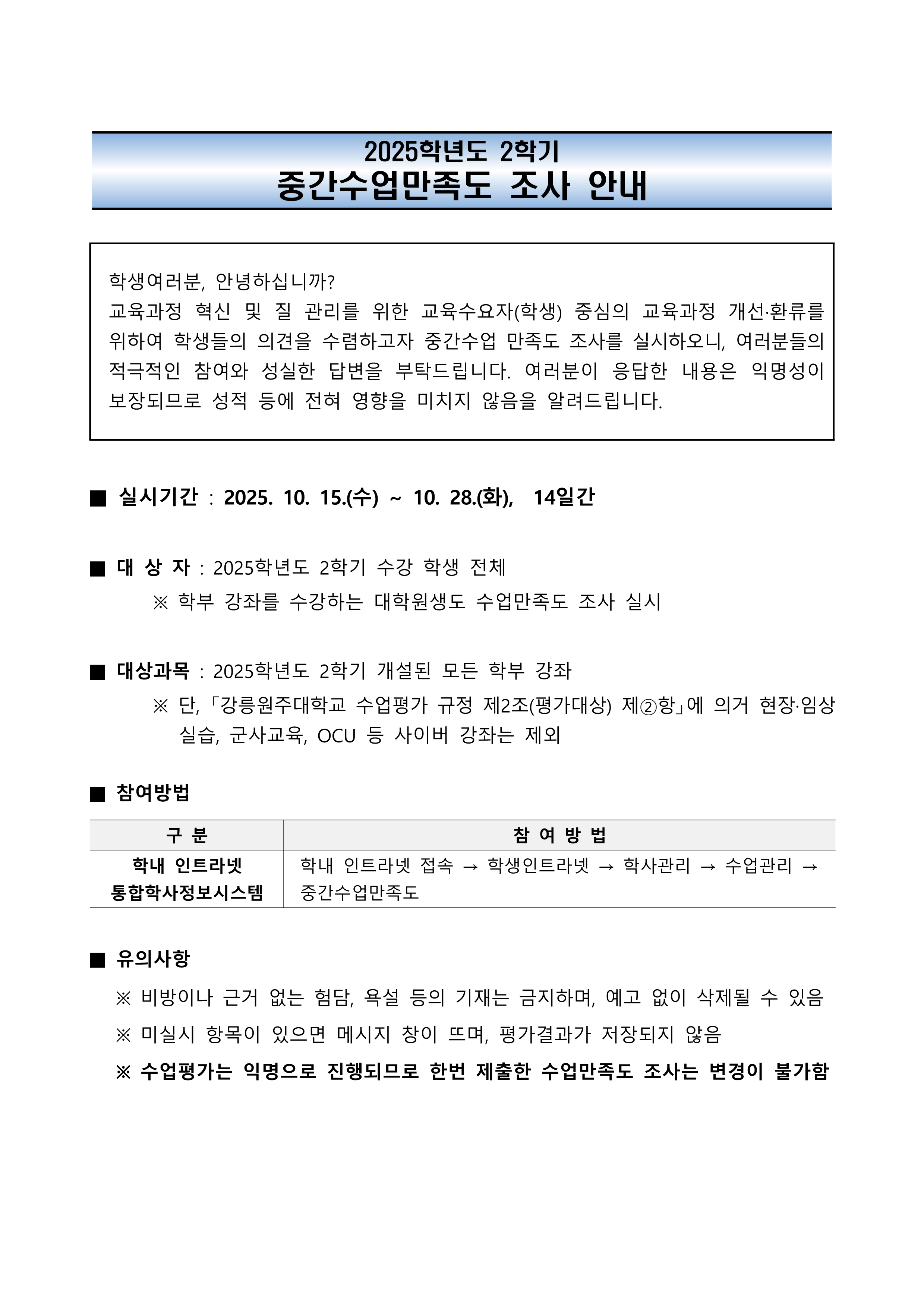 fnctId=bbs,fnctNo=877 2025학년도 2학기 중간 수업만족도(수업평가) 조사 안내 및 협조 요청 작성일 2025.10.02 작성자 정하나 조회수 668 첨부파일 3. 강릉원주대학교 중간수업만족도 매뉴얼(학생용)-2-3.pdf